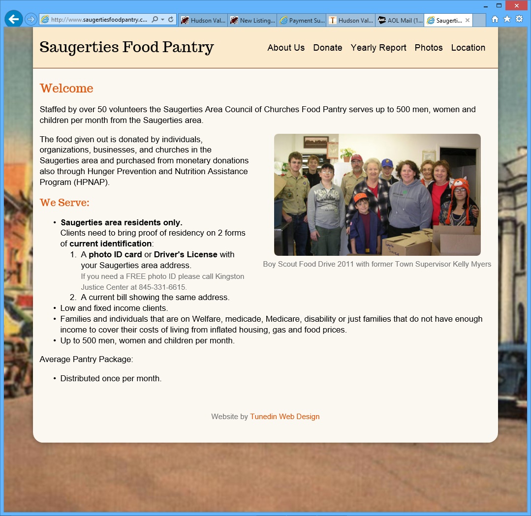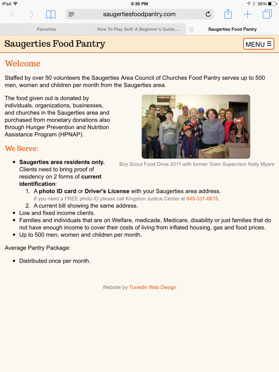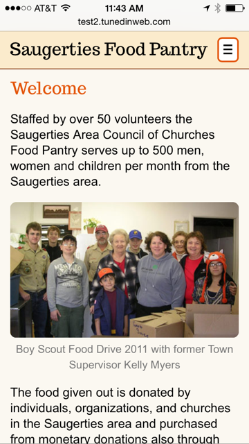 "Responsive" websites are designed as a single site that displays well on all types of devices -- desktop browsers, tablets, and smart phones. Responsive sites adapt themselves to the size of screen the user has in order to display well on that screen. They are a good choice for clients who primarily need a mobile website, and where support for tablets or browser is needed but secondary. We have recently build a fully responsive website for a Hudson Valley client -- The Saugerties Food Pantry. This client needed primarily a mobile site to serve it's clients, who would be accessing the site mostly via mobile devices. This is a very simple website, so it's a good example to use to see the elements of the design that respond to the screen size.
