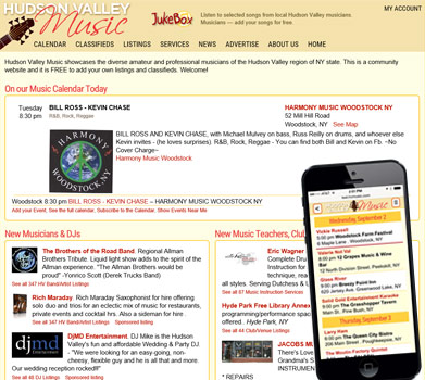 This site highlights the musical heritage in our own backyard - the Hudson Valley region of NY state. We have been building this site as a personal labor of love since 1997. It's a completely database-driven site, programmed in PHP and MySQL, where users log in to submit and manage their own listings, from either their desktop computer or mobile phone.